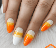 - Create candy corn patterns on each nail with orange, yellow, and white polish.