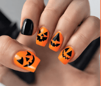 - Paint grinning Jack-O’-Lantern faces on each nail using black nail polish. Add triangle eyes and a toothy grin.